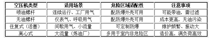 带防爆认证的喷油螺杆机最常用:耐用、连续运行、抗恶劣环境。仪表气优先无油机型。